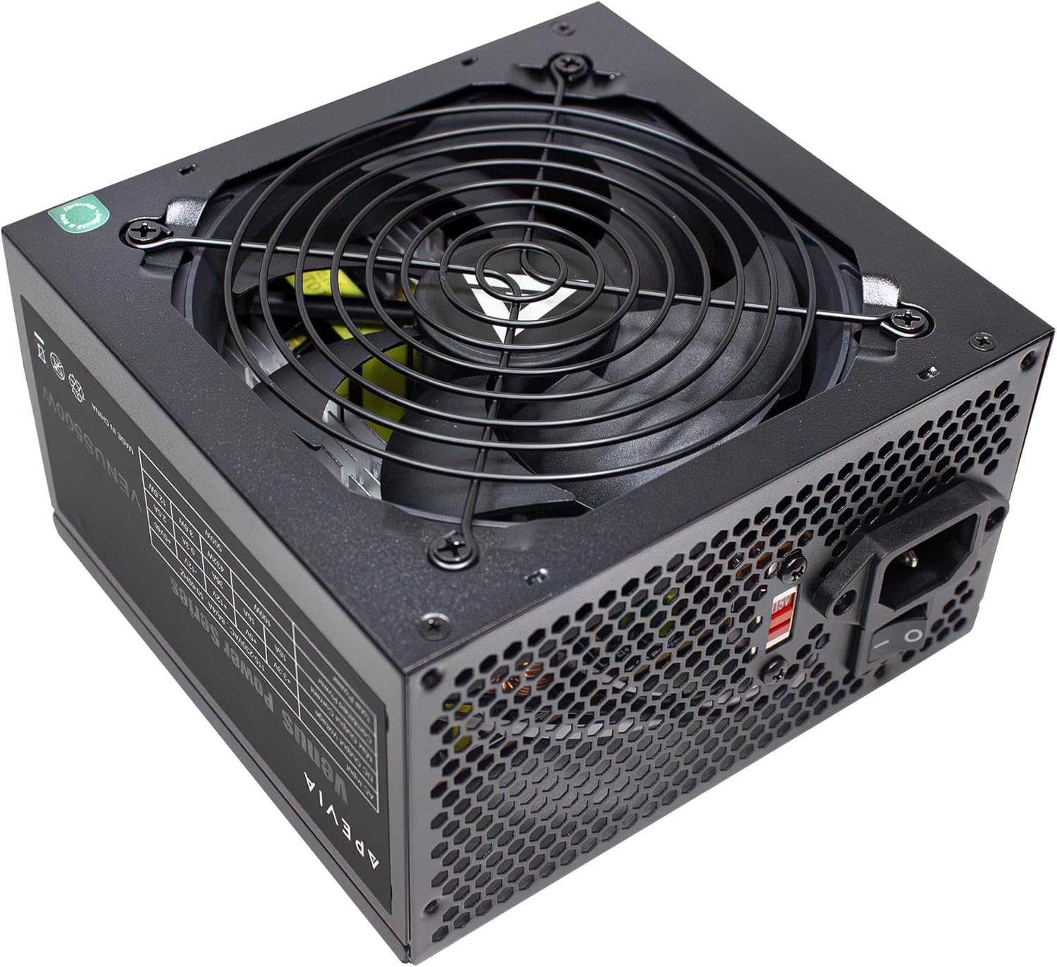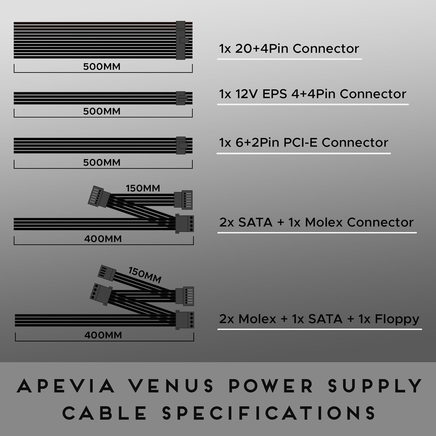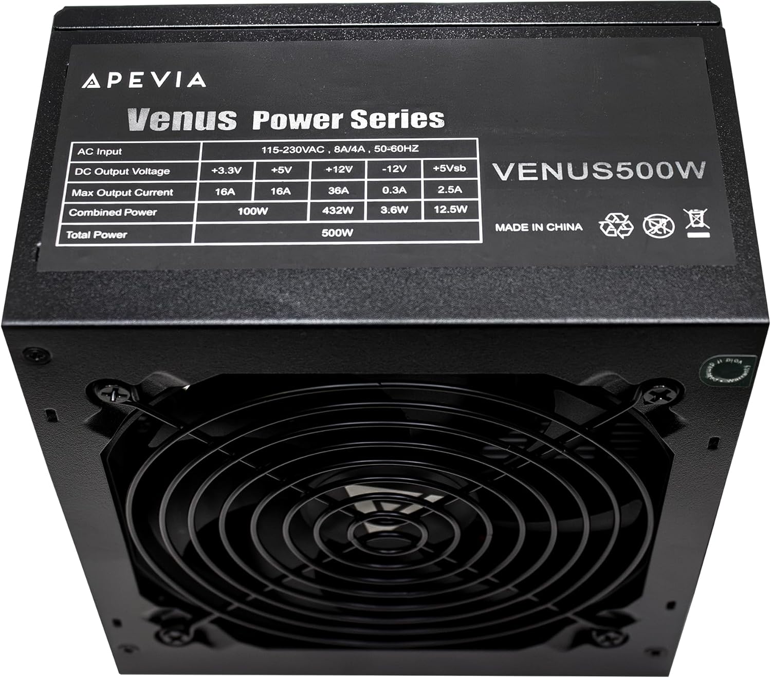 Apevia VENUS500W Venus Series 500W Power Supply. 1 x 20/24pin Main Power/1 x 12V(P4+4)/1x 6+2 PCI Express/3 x SATA/3 x Molex/1 x Floppy Connectors. Auto-Thermally Controlled 120mm Black Fan. 115/230V Switch. 5% Tolerance of 5V, 3.3V & 12V Output. Max. Output Current +3.3V(16A), +5V(16A), +12V(36A), -12V(0.3A), +5Vsb(2.5A). Short-Circuit/Over-Current/Over-Voltage/Over-Power/Under-Voltage/Over-Temperature Protections. For safety, do not overload, abuse or modify the power supply unit. Use of this unit for Bitcoin Mining is not suggested since it will shorten the life and cause failures of power supply. Use for mining purposes is not covered by warranty.
