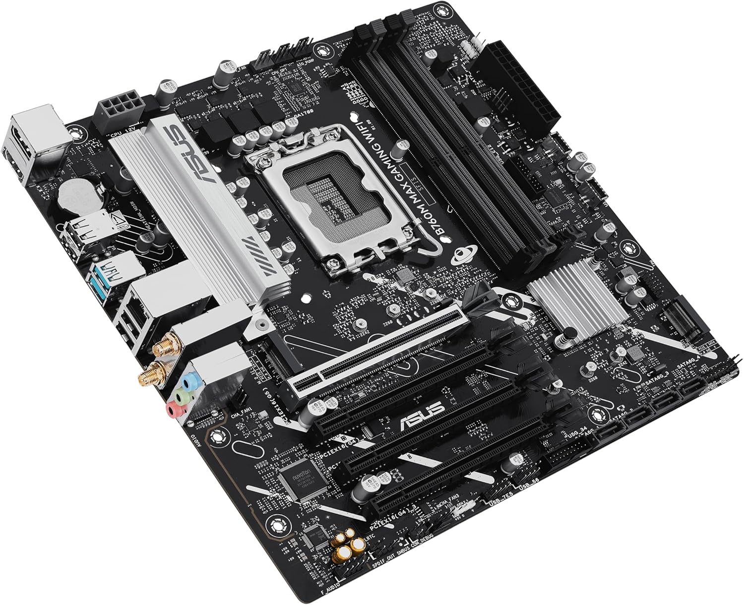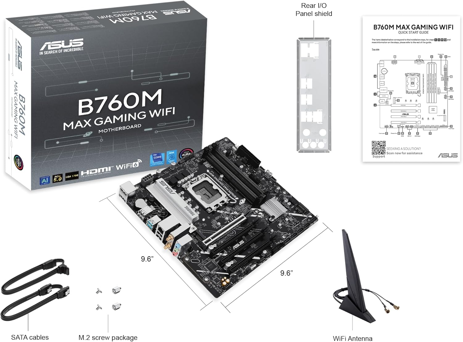 ASUS B760M MAX GAMING WIFI is equipped with outstanding features, including PCIe 5.0 x16 SafeSlot, DDR5, three M.2 slots, Wi-Fi 6, USB 10Gbps Type-A, USB 5Gbps Type-C®, DisplayPort/HDMI, Aura Sync, ASUS 5X PROTECTION III, which will bring users maximizing performance, stability and compatibility for the very best DIY PC experiences.