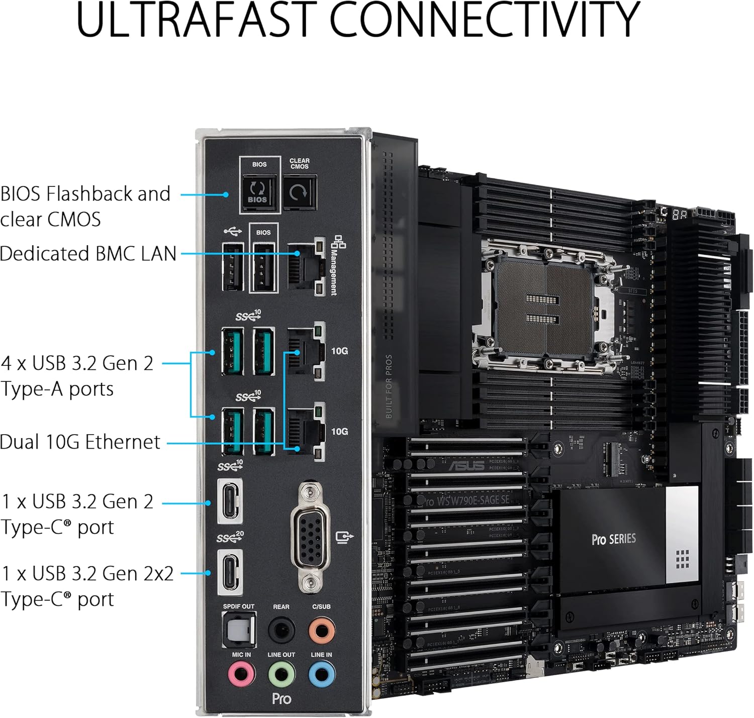 ASUS Pro WS W790 SAGE SE workstation motherboard is deftly tailored for creative professionals, developers, and engineers, unleashing the dominate performance of the latest Intel Xeon processors, with CPU and memory overclocking capability. Featuring an optimized memory trace layout, advanced power stage design, server-grade IPMI remote management, and ultrafast PCIe 5.0 and networking connectivity, Pro WS W790 series melds no-compromise engineering with incredible aesthetics.