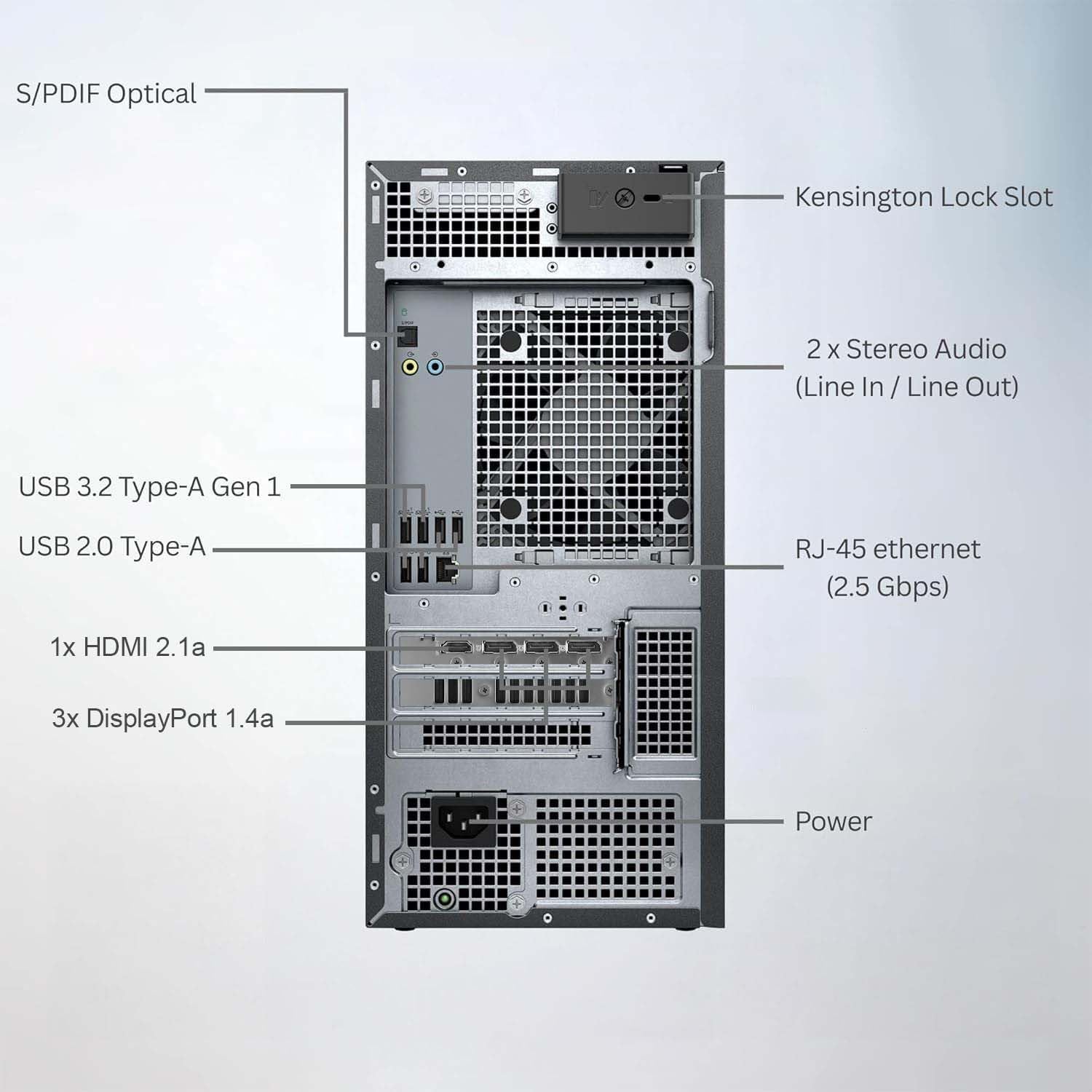Dell Tower Plus EBT2250 Desktop ComputerProcessorIntel Core Ultra 9 285 processor (24-Core, 76MB Total Cache, Base 2.5GHz, Turbo up to 5.6GHz)Operating SystemWindows 11 HomeGraphics CardNVIDIA GeForce RTX 5070 12GB GDDR7MemoryDDR5 5600 MHzStorageM.2 PCIe NVMe Solid State DriveWirelessIntel Wi-Fi 7 BE200 (2×2) 802.11ax Wireless LAN and BluetoothFront Ports3x USB 3.2 Type-A Gen 11x USB 3.2 Type-C Gen 2 (no video/audio output)1x Headset jack1x SD card slotRear Ports4x USB 2.0 Type-A2x USB 3.2 Type-A Gen 13x DisplayPort 1.4a 1x HDMI1x RJ45 Ethernet Port, 1GbE2x Stereo Audio (Line In / Line Out)1x S/PDIF Optical 1x Kensington lock slotKeyboardDell Wired Keyboard – KB216 – US English – BlackMouseDell Wired Mouse – MS116 – BlackDimensions & WeightHeight: 14.68” (372.90 mm)Width: 6.81” (173.00 mm)Depth: 16.80” (426.90 mm)Weight: 19.00 lb (8.62 kg)