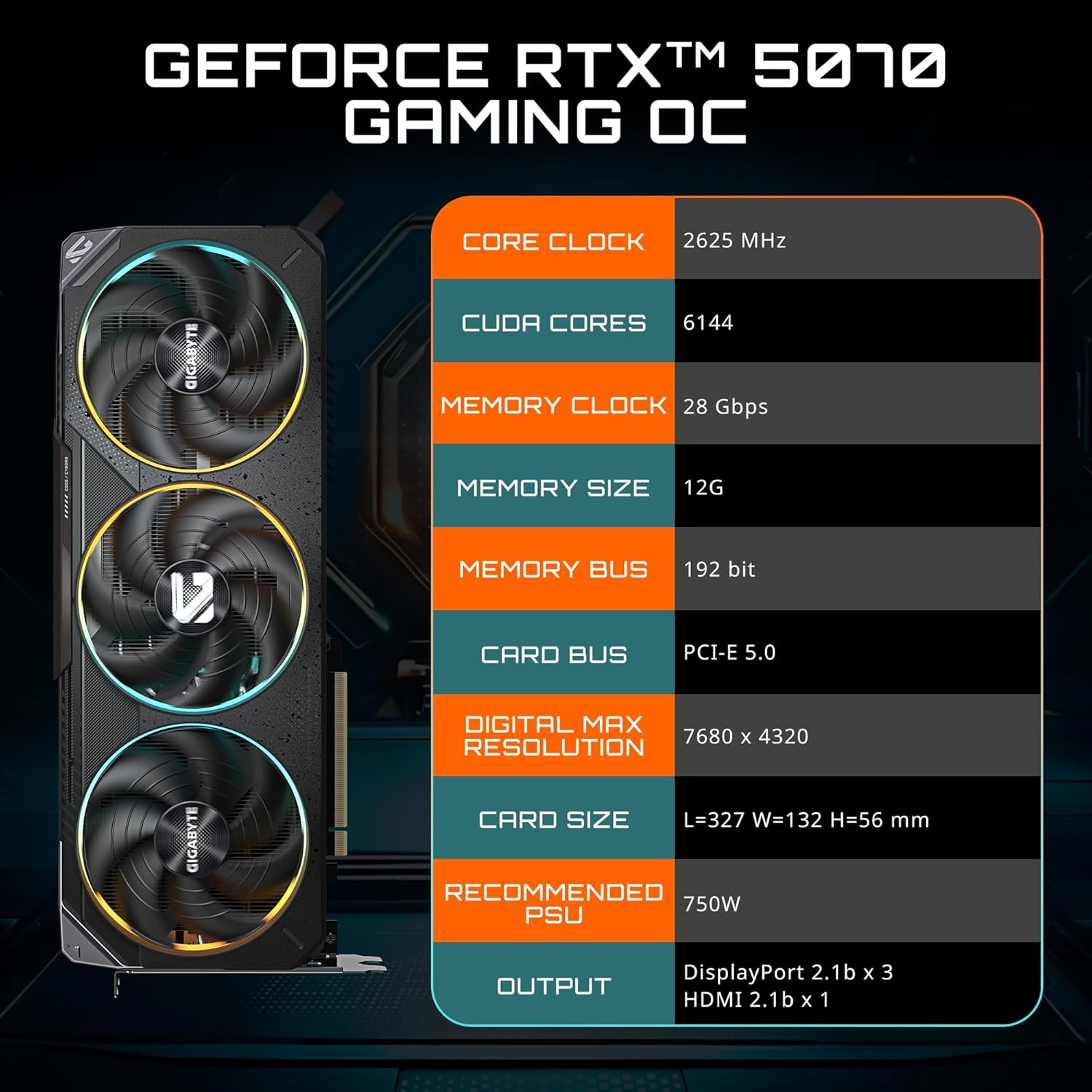 Ahead of its time, ahead of the game is the GIGABYTE GeForce RTX 5070 GAMING OC 12G Graphics Cards. Powered by NVIDIA’s new RTX architecture, the GIGABYTE GeForce RTX 5070 GAMING OC 12G brings stunning visuals, amazingly fast frame rates, and AI acceleration to games and creative applications with its enhanced RT Cores and Tensor Cores, along with a staggering 12 GB of GDDR7 memory.