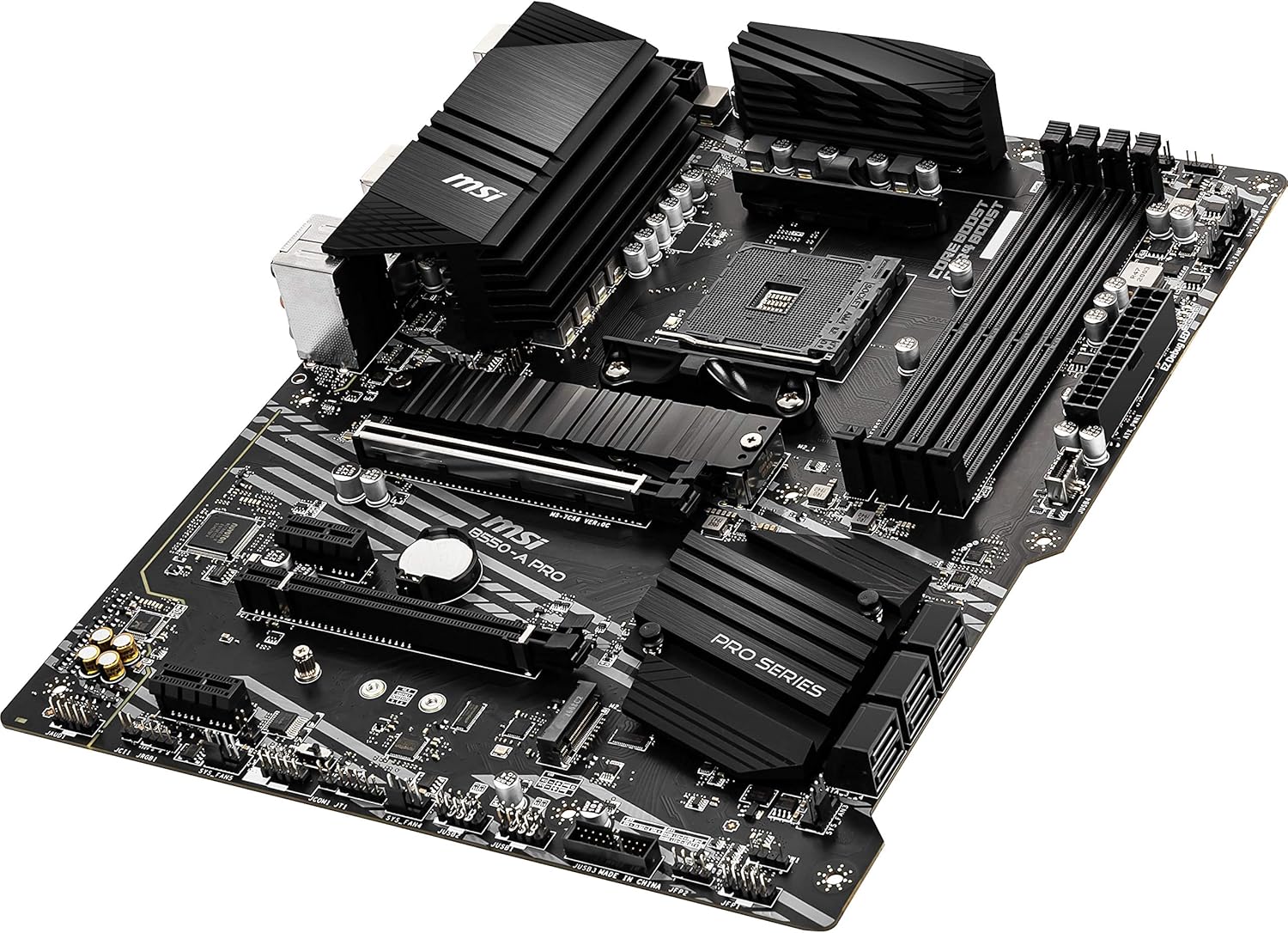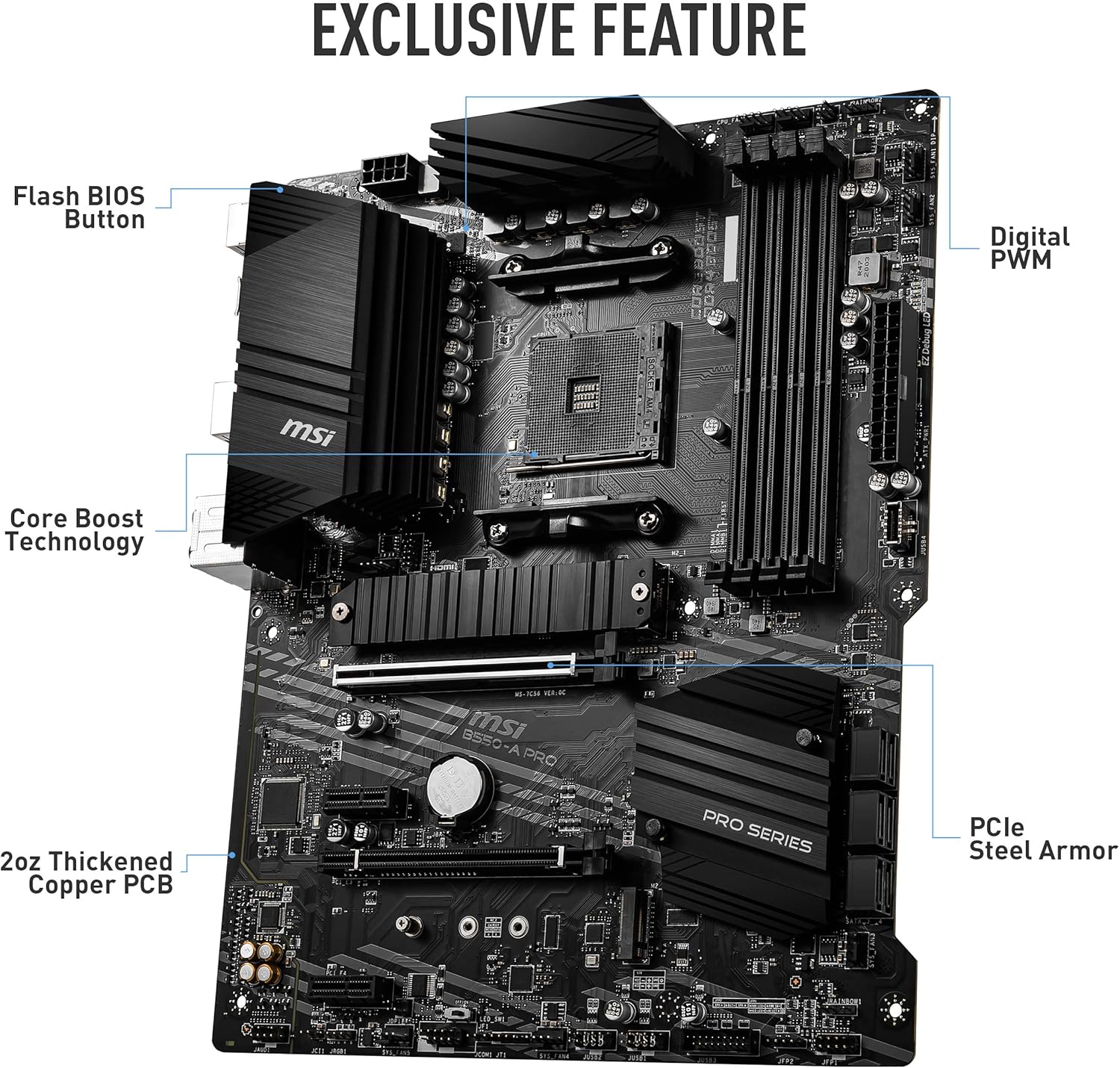 Powered by AMD Ryzen AM4 processors, the MSI B550-A PRO combines stable functionality and high-quality assembly to solve professional workflows. Extended Heatsink Design and Core boost keep critical components operating reliably. PCIe 4.0 slots and M.2 with Shield Frozr provides the latest in device connectivity.