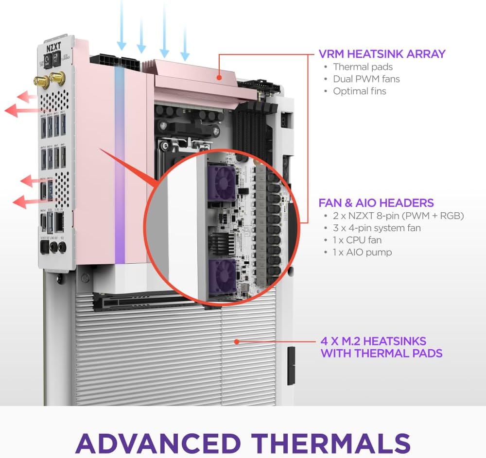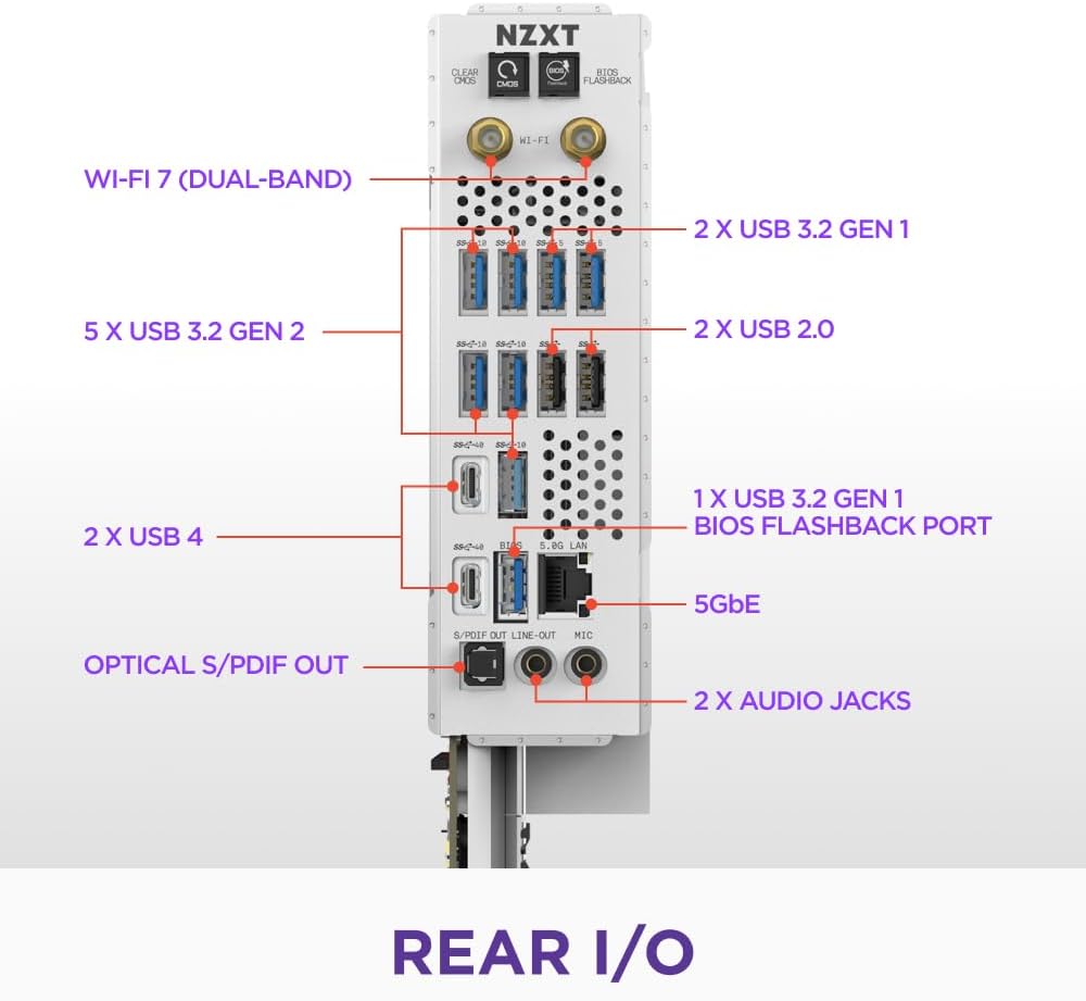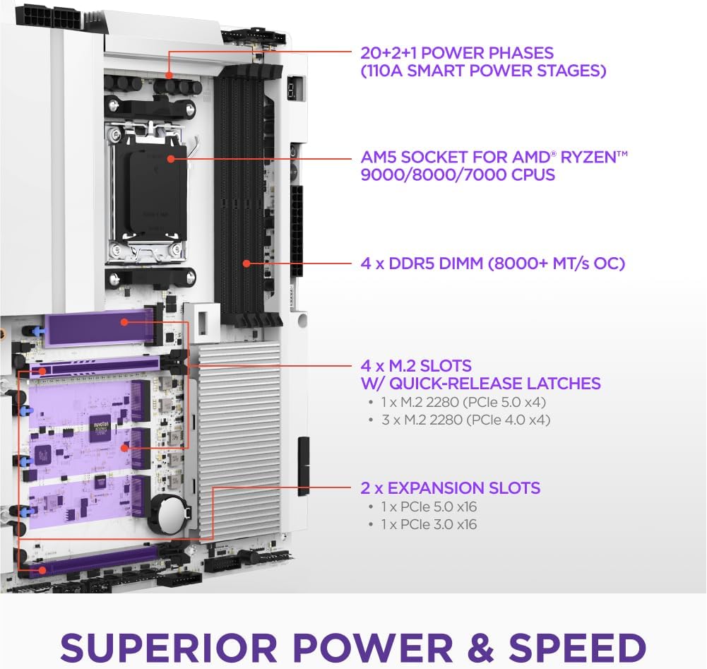 The NZXT N9 X870E is a high-performance ATX gaming motherboard designed for AMD Ryzen 9000, 8000, and 7000 series processors with an AM5 socket. It features a 20+2+1 power phase design, advanced thermal solutions, and PCIe 5.0 for next-gen GPUs. With four quick-release M.2 slots, DDR5 support, USB4, Wi-Fi 7, and 5GbE, it delivers ultra-fast storage and seamless networking. A full-metal cover ensures a sleek, modern look along with customizable onboard RGB lighting.