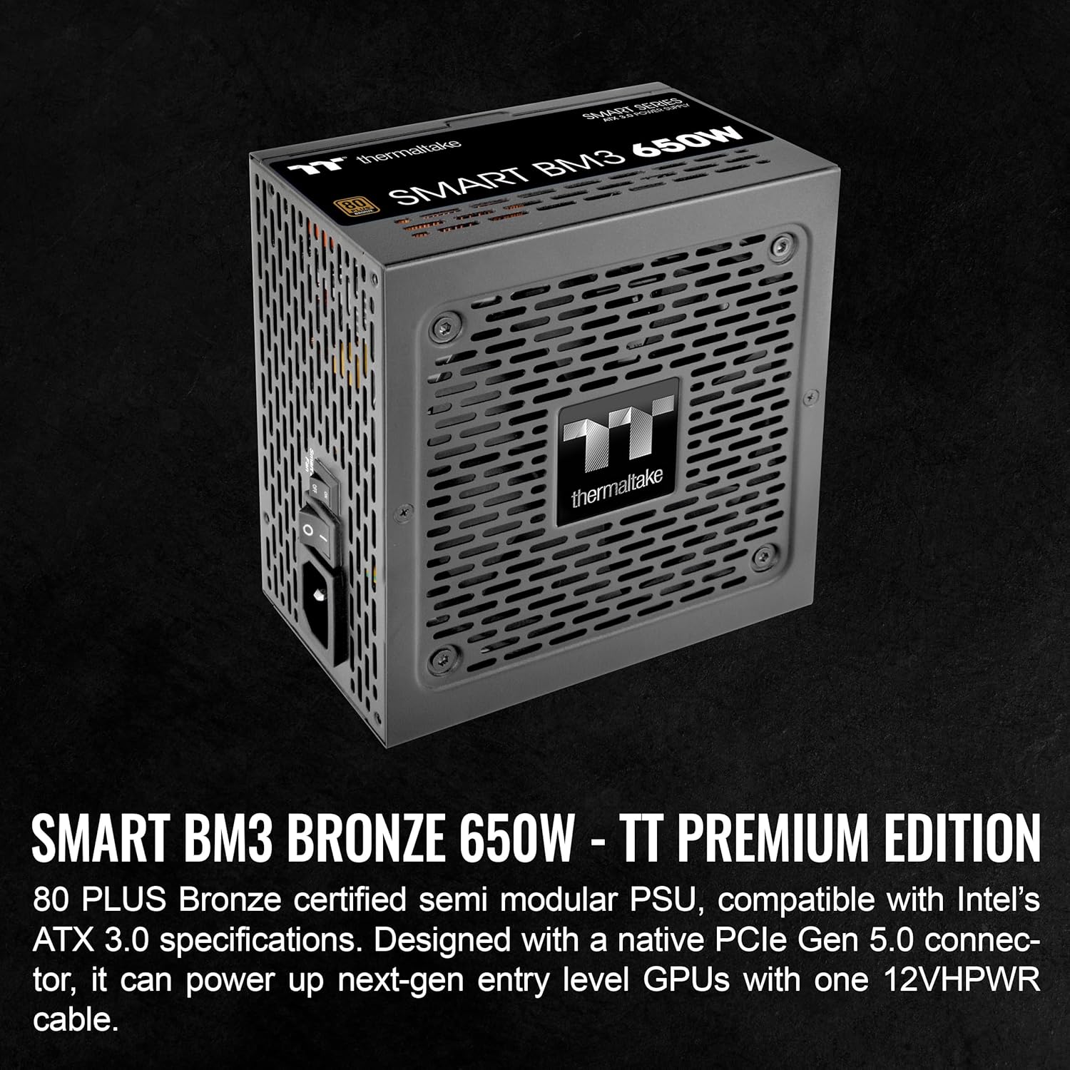 Smart BM3 80 PLUS Bronze certified semi modular PSU (650W/750W/850W) is designed to meet ATX 3.0 standards, it also comes with one PCIe Gen 5.0 (12VHPWR) connector to support modern graphics cards. With an ample 5-year warranty, the Smart BM3 series is able to satisfy the market, where value-oriented users are looking for a new power supply with all the latest features. Featuring a 120mm FDB fan to deliver excellent airflow. Furthermore, with the Smart Zero Fan function the fan will not spin until the load exceeds 20% of the power supply, minimizing undesired noise. It also built with high quality Japanese main electrolytic capacitor greatly improves the power supplies durability. •P/N: PS-SPD-0650MNFABU-3 •MODEL: SPD-650AH2CLB •WATTS: 650W •MAX OUTPUT CAPACITY: 650W •COLOR: Black •DIMENSIONS: 150mm(W)x86mm(H)x140mm(D) •PFC (POWER FACTOR CORRECTION): Active PFC •POWER GOOD SIGNAL: 100-150 msec •HOLD UP TIME: 17msec •INPUT CURRENT: 15A-6A •INPUT FREQUENCY RANGE: 50Hz/60Hz •INPUT VOLTAGE: 100-240V~ •OPERATING TEMPERTURE: 5°C to + 40°C •OPERATING HUMIDITY: 20% to 85%,non-condensing •STORAGE TEMPERTURE: -40°C to + 55°C •STORAGE HUMIDITY: 10% to 95%, non-condensing •COOLING SYSTEM: 12cm FDB Fan •EFFICIENCY: Meet 80 PLUS® Bronze at 115Vac input. •MTBF: 100,000 hrs minimum •SAFETY APPROVAL: FCC/ICES/CB/cTUVus/S-mark •PCI-E 6+2PIN: 4 •PCI-E 12+4PIN: 1(300W) •PCI-E CONNECTOR: OCP/OVP/UVP/OPP/OTP/SCP